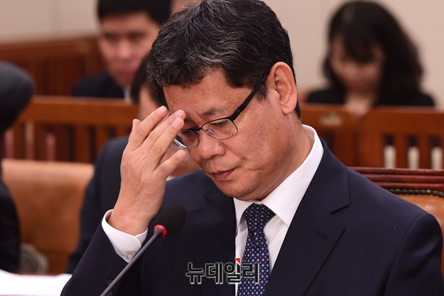 김연철 통일부장관 후보자가 26일 오후 국회 외교통일위원회 전체회의실에서 열린 인사청문회에서 출석해 안경을 고쳐쓰고 있다.