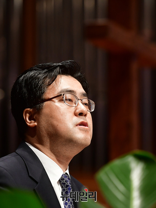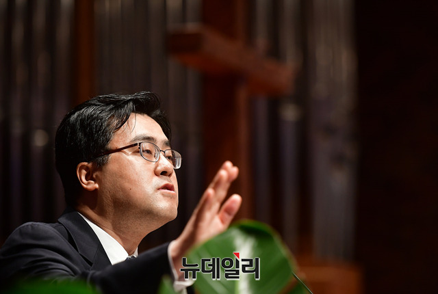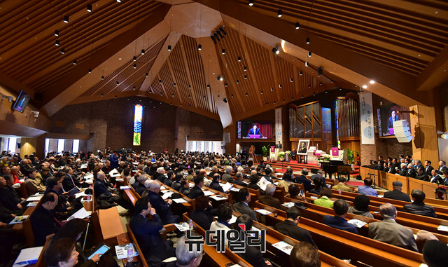 이호 목사가 26일 오후 서울 중구 정동제일교회에서 열린 이승만 대통령 탄신 144주년 기념식에서 '우남 이승만의 아리랑'을 주제로 설교하고 있다. 이날 기념식에는 우남 이승만 전집 발간 헌정식이 진행됐다.