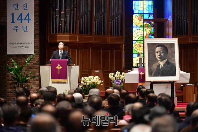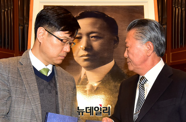 신철식 우남 이승만 기념사업회 회장과 김명섭 이승만연구원장이 26일 오후 서울 중구 정동제일교회에서 열린 이승만 대통령 탄신 144주년 기념식에서 발간된 이승만 전집을 들고 기념촬영을 하고 있다.
