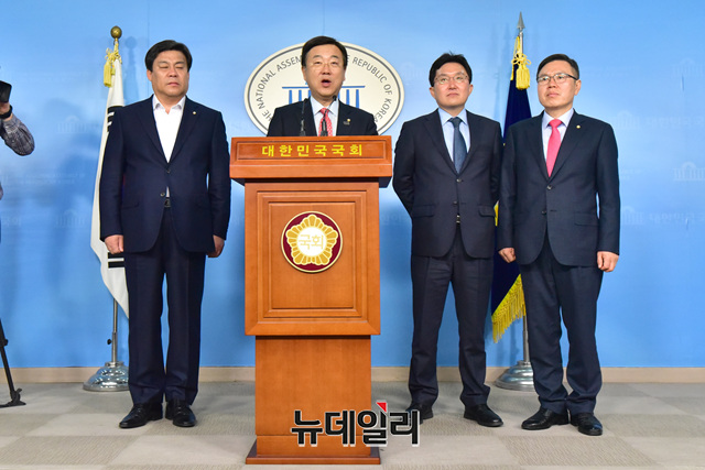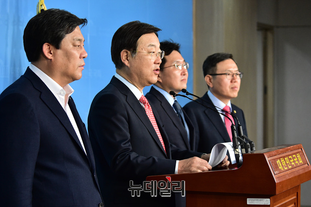 자유한국당 김종석 정무위 간사 등 소속상임위 한국당 의원들이 27일 오전 국회 정론관에서 손혜원 의원 아버지의 독립유공자 선정 특혜 의혹과 관련된 국가보훈처의 자료제출 거부 관련 기자회견을 갖고 있다.
