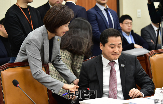 나경원 자유한국당 원내대표 27일 오전 국회에서 열린 조동호 과학기술정보통신부장관 후보자 인사청문회를 찾아 의원들을 격려하고 있다.