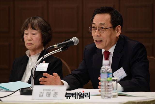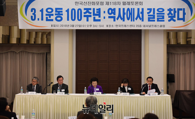 김태준 동덕여대 교수가 27일 오후 서울 중구 한국프레스센터 내셔널프레스클럽에서 열린 한국선진화포럼 제118차 월례토론회에서 '3.1운동 100주년 : 역사에서 길을 찾다' 라는 주제로 토론을 하고 있다.