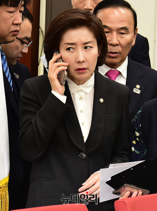 나경원 자유한국당 원내대표가 28일 오전 국회에서 열린 '문정권 문제인사청문회 평가 회의'에 전화를 하며 참석하고 있다.