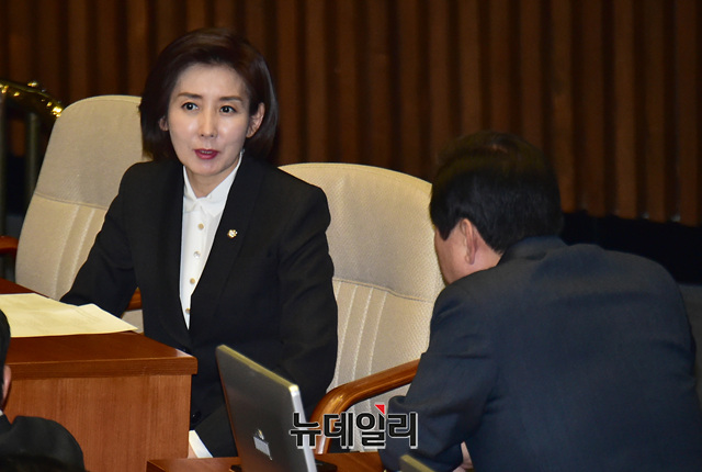 나경원 자유한국당 원내대표와 김무성 의원이 28일 오후 국회에서 열린 본회의에서 대화를 나누고 있다.