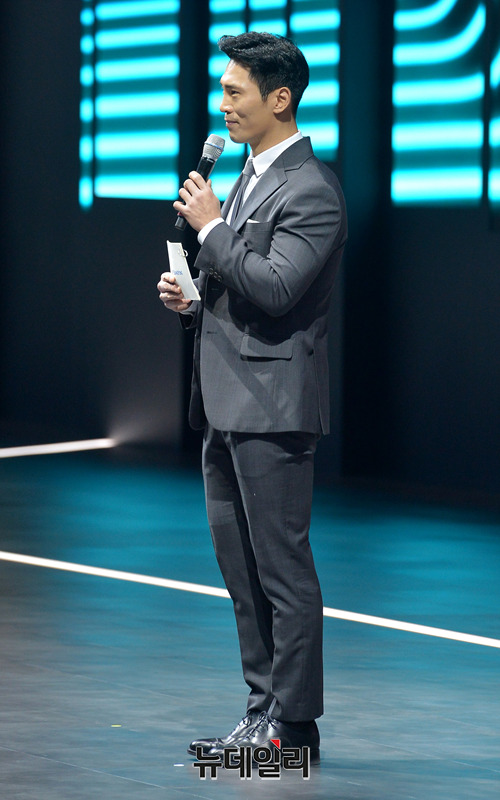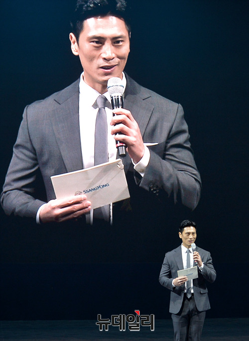 개그맨 김재우가 28일 오전 경기 고양시 일산 킨텍스에서 열린 '2019 서울모터쇼' 컨퍼런스 쌍용자동차 부스에서 행사진행을 하고 있다.