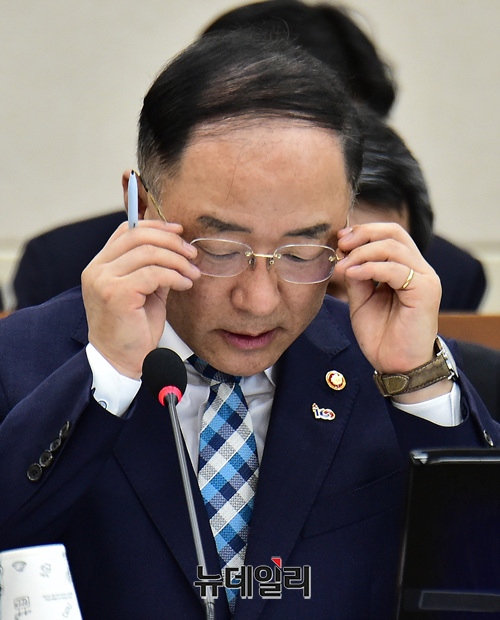 홍남기 경제부총리 겸 기획재정부 장관이 29일 오전 국회 기획재정위원회 전체회의에 참석해 안경을 고쳐쓰고 있다.