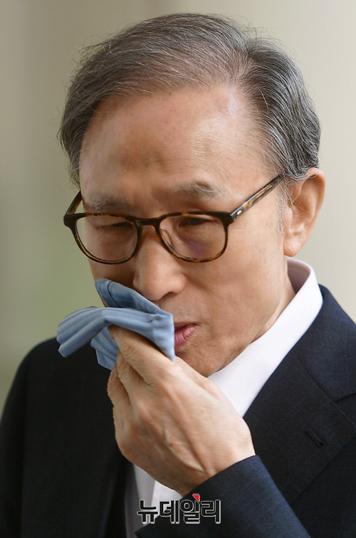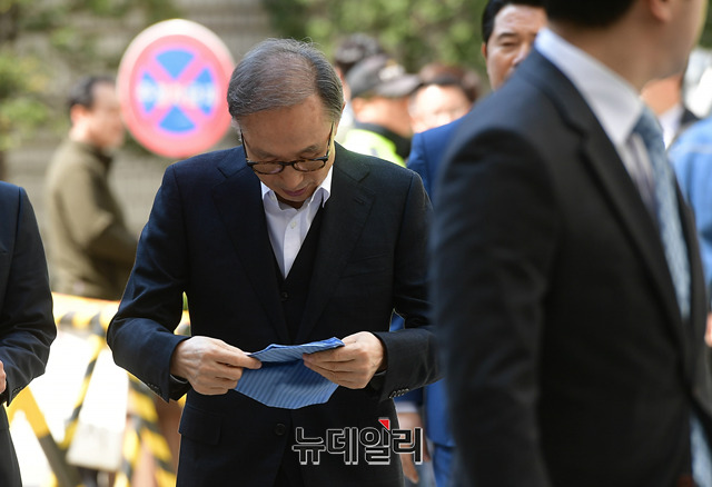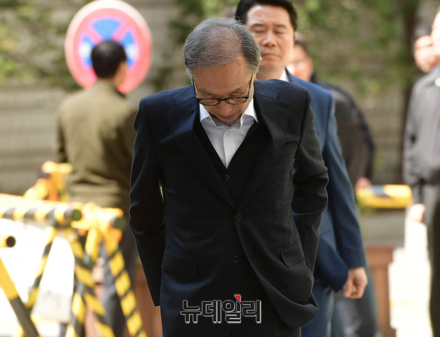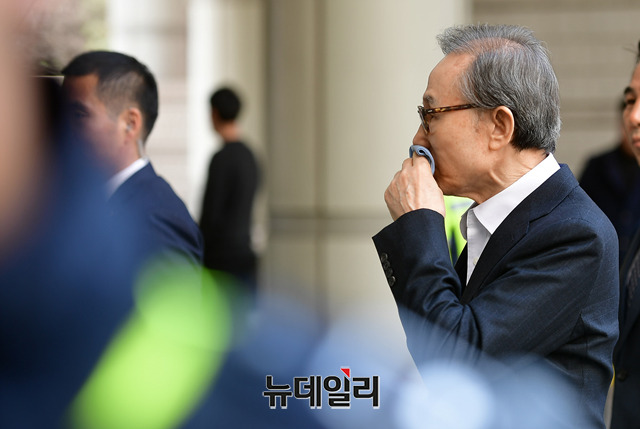이명박 전 대통령이 29일 오후 서울 서초구 서울고등법원에서 열린 재판에 참석하기 위해 법정으로 향하고 있다.