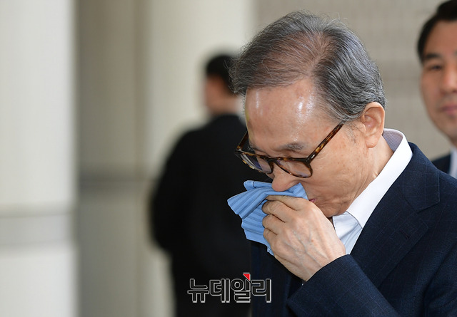 이명박 전 대통령이 29일 오후 서울 서초구 서울고등법원에서 열린 재판에 참석하기 위해 법정으로 향하고 있다.