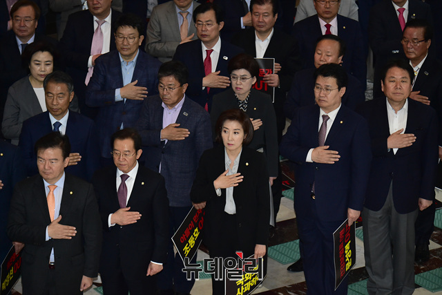 나경원 자유한국당 원내대표 등 소속 의원들이 29일 오후 국회 로텐더홀에서 열린 '정경두 국방부 장관 해임 촉구 및 문재인 정권 인사참사 규탄대회'에 앞서 국민의례를 하고 있다.