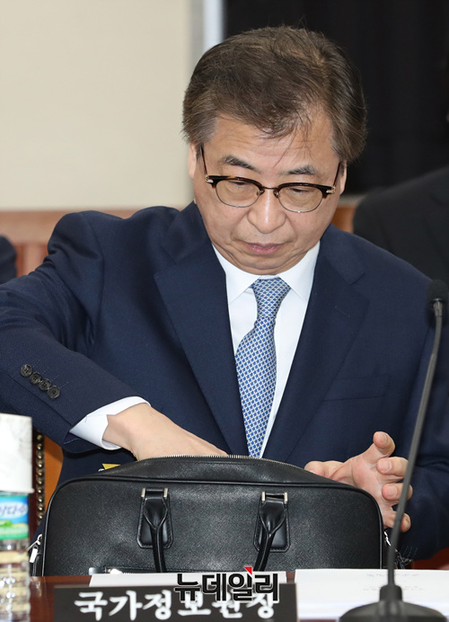 서훈 국가정보원장이 29일 오전 국회에서 열린 정보위원회 전체회의에 참석해 회의 시작을 기다리고 있다.