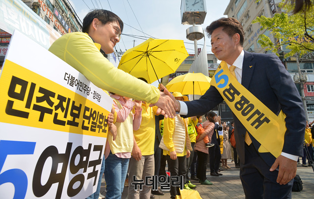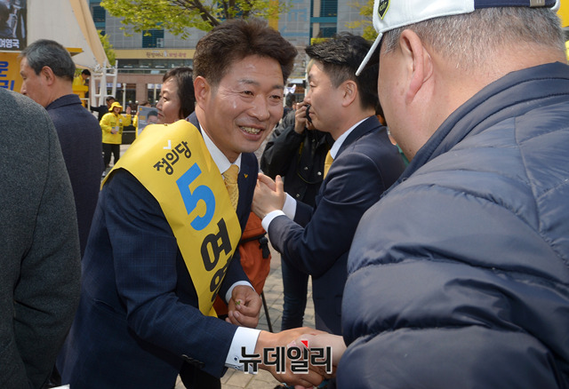 여영국 정의당 창원성산 보궐선거 후보가 30일 오후 경남 창원시 상남분수광장에서 시민들에게 지지를 호소하고 있다.