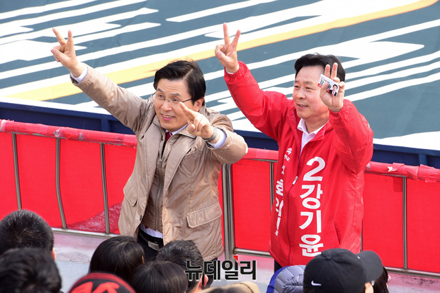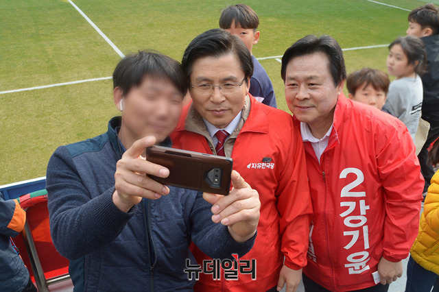 황교안 자유한국당 대표와 강기윤 창원·성산 보궐선거 후보가 30일 오후 경남FC 축구경기장에서 시민들에게 지지를 호소하고 있다.