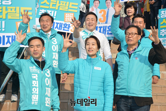 손학규 바른미래당 대표, 채이배 의원, 김수민 의원, 이재환 창원·성산 보궐선거 후보 및 당원들이 30일 오후 경남 창원시 창원축구센터에서 시민들에게 지지를 호소하고 있다.
