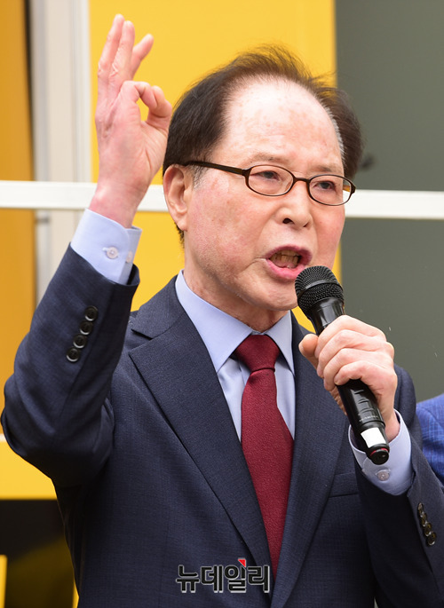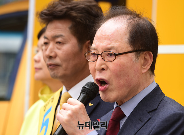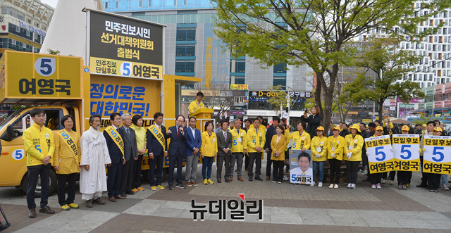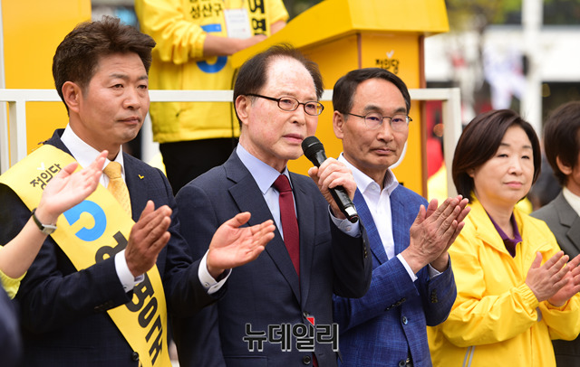 권영길 전 국회의원이 30일 오후 경남 창원 상남분수광장에서 열린 '민주-진보-시민선대위 출범식'에 참석한 시민들에게 여영국 정의당 창원·성산 보궐선거 후보의 지지를 호소하고 있다.
