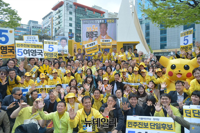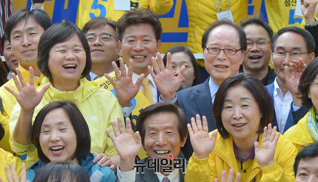 여영국 정의당 창원·성산 보궐선거 후보가 30일 오후 경남 창원시 상남분수광장에서 열린 '민주-진보-시민선대위 출범식'에서 이정미 정의당 대표, 심상정·윤소하 국회의원, 권민호 더불어민주당 전 의원, 권영길 전 민주노동당 대표 및 지지자들과 기념촬영을 하고 있다.창원시 성산구 보궐선거는 자유한국당 강기윤 후보, 바른미래당 이재환 후보, 더불어민주당 후보와 단일화한 정의당 여영국 후보, 민중당 손석형 후보, 대한애국당 진순정 후보, 무소속 김종서 후보가 나섰다. (경남 창원=박성원 기자)