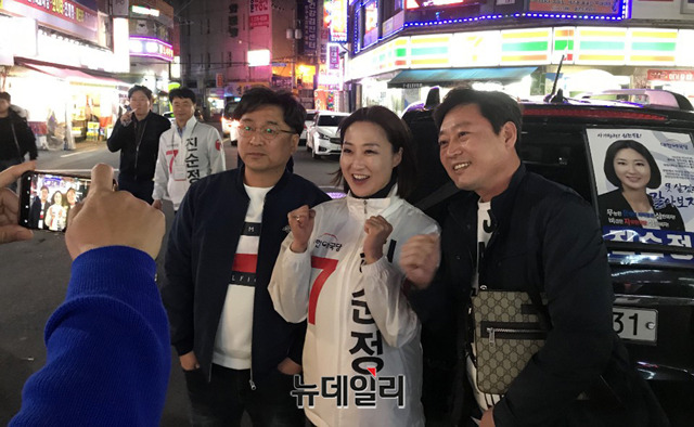 진순정 대한애국당 창원·성산 보궐선거 후보가 30일 오후 경남 창원시 중앙동오거리에서 시민들에게 지지를 호소하고 있다.