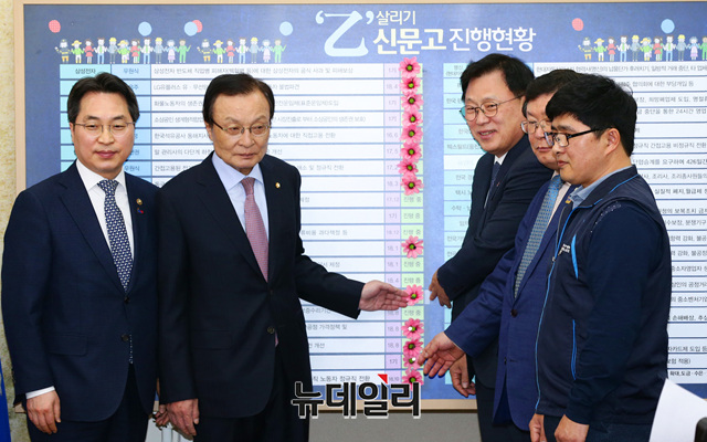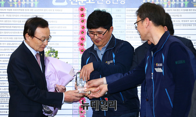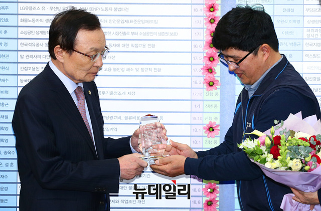 이해찬 더불어민주당 대표가 1일 오전 국회 당대표회의실에서 열린 을지로 상생 꽃달기 행사에서 감사패을 받고 있다. 이날 행사는 방송제작 스태프의 근로 환경 개선 관련해 열렸다.