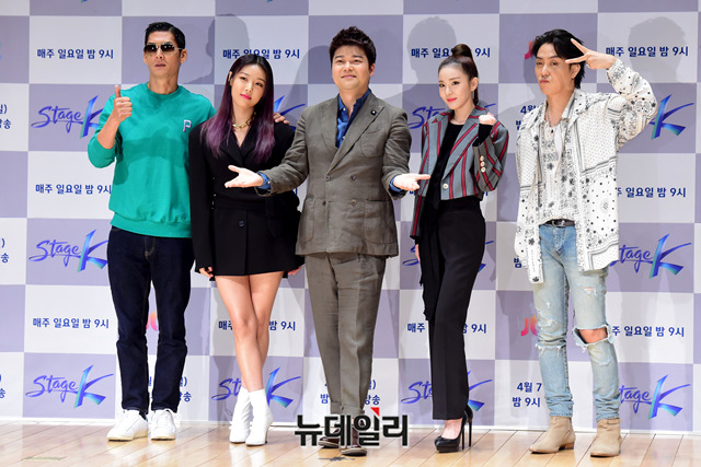 가수 박준형(왼쪽부터), 산다라박, 아나운서 전현무, 가수 유빈, 은지원이 2일 오후 서울 마포구 JTBC사옥에서 열린 '스테이지K' 제작발표회에 참석해 포토타임을 갖고 있다.