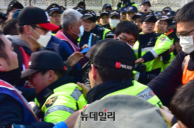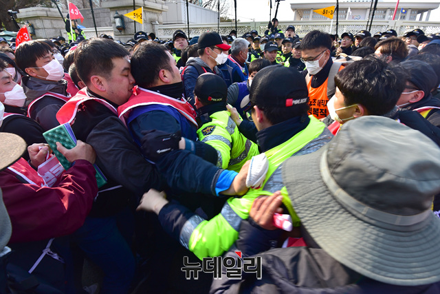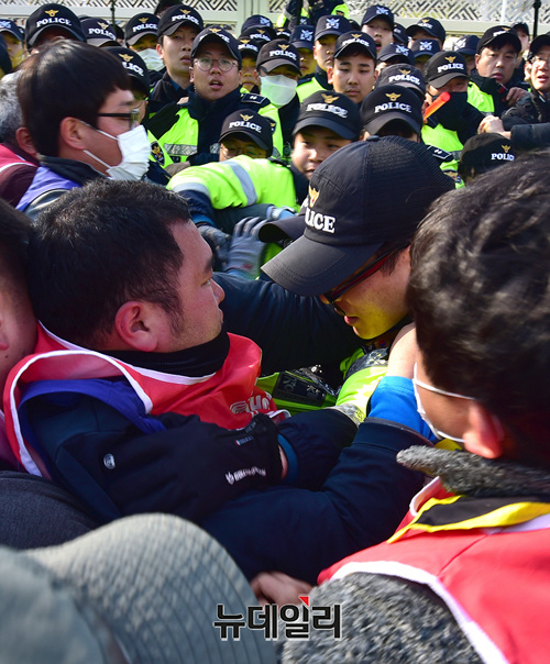 최저임금제 개혁과 탄력근로제를 반대하는 민노총(전국민주노동조합총연맹) 노조원들이 2일 오후 국회 본청 진입을 시도하며 경찰을 끌어내고 있다.