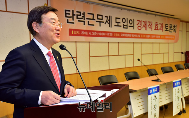 김종석 자유한국당 의원이 3일 오전 국회 의원회관에서 열린 '탄력근무제 도입의 경제적 효과 토론회'에서 개회사를 하고 있다. 이날 토론회는 재단법인 파이터치연구원이 주관했다.