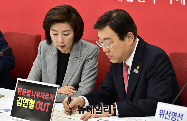 나경원 자유한국당 원내대표가 3일 오전 국회에서 열린 원내대책회의에서 김종석 의원과 대화를 나누고 있다.