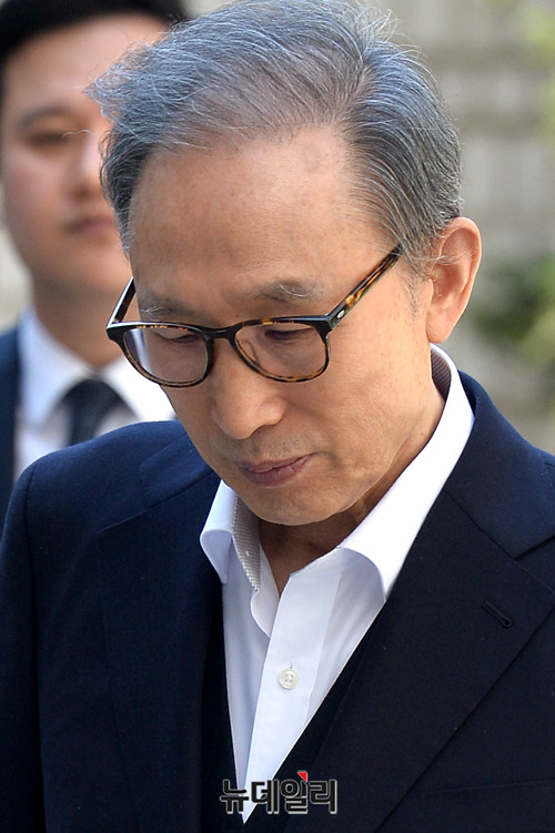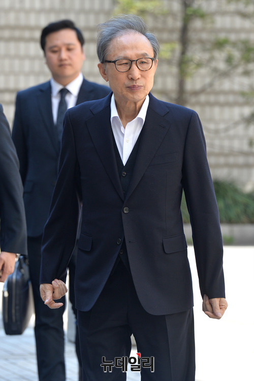 이명박 전 대통령이 3일 오후 서울 서초구 서울고등법원에서 열린 17차 공판에 출석하고 있다. 증인 출석 예정이던 에이킨검프 소속 김석한 변호사는 불출석했다.