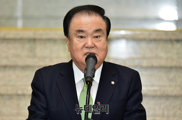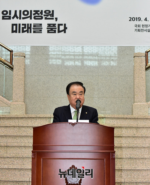 문희상 국회의장이 3일 오전 국회 헌정기념관에서 열린 임시의정원 개원 100주년 기념 '임시의정원, 미래를 품다' 특별전 개막식 참석해 축사를 하고 있다.