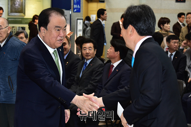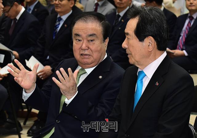 문희상 국회의장과 정세균 전 국회의장이 3일 오전 국회 헌정기념관에서 열린 임시의정원 개원 100주년 기념 '임시의정원, 미래를 품다' 특별전 개막식 참석해 인사를 나누고 있다.