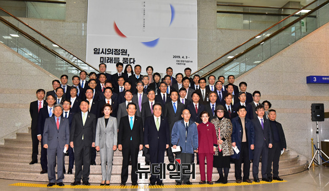 문희상 국회의장, 정세균 전 국회의장, 나경원 자유한국당 원내대표, 김관영 바른미래당 원내대표 등 참석자들이 3일 오전 국회 헌정기념관에서 열린 임시의정원 개원 100주년 기념 '임시의정원, 미래를 품다' 특별전에서 기념사진을 촬영하고 있다.