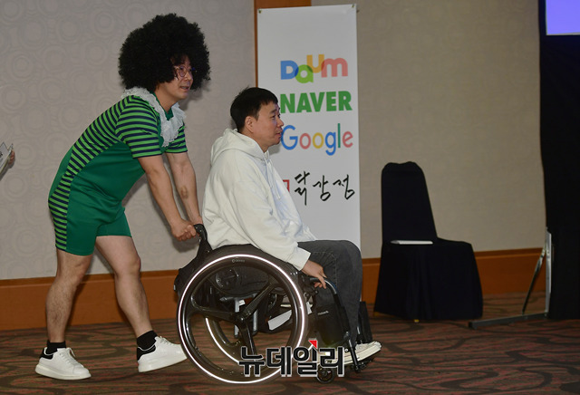 가수 강원래가 3일 오후 서울 마포구 베스트웨스턴 프리미어 서울 가든호텔에서 열린 '전유성의 쑈쑈쑈 : 사실은 떨려요' 제작발표회에 후배들의 도움을 받으며 입장하고 있다.