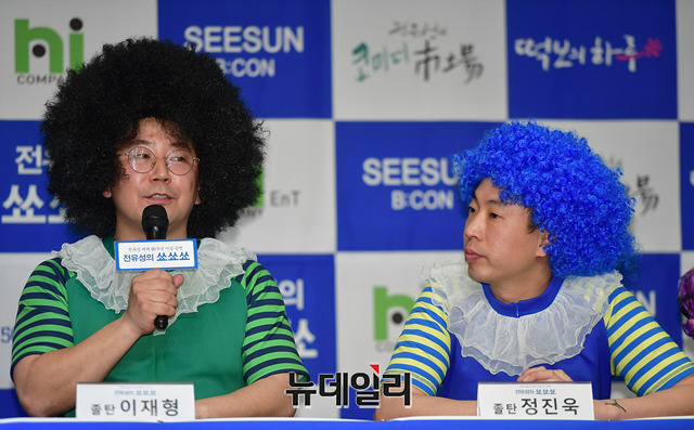 졸탄 멤버 이재형, 정진형이 3일 오후 서울 마포구 베스트웨스턴 프리미어 서울 가든호텔에서 열린 '전유성의 쑈쑈쑈 : 사실은 떨려요' 제작발표회에서 인사말을 하고 있다.