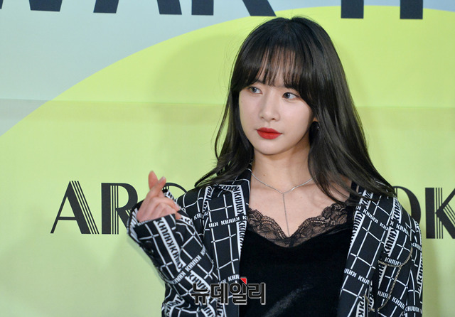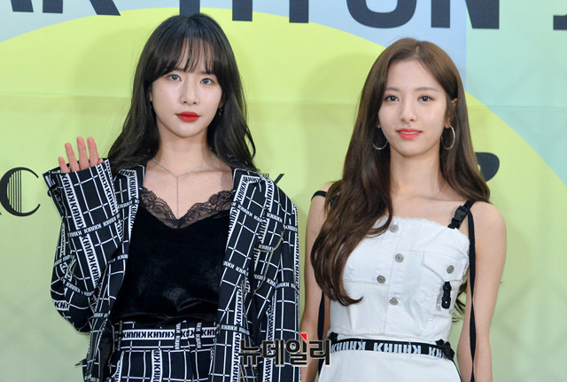걸그룹 우주소녀 설아(왼쪽), 보나가 3일 오후 서울 중구 아크앤북에서 열린 '곽현주 컬렉션 2019 F/W오프쇼'에 참석해 포토타임을 갖고 있다.