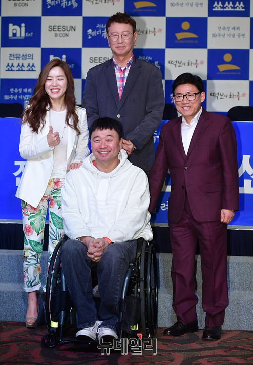 개그맨 전유성, 김학래, 최양락, 엄용수, 김지선, 졸탄, 가수 강원래가 3일 오후 서울 마포구 베스트웨스턴 프리미어 서울 가든호텔에서 열린 '전유성의 쑈쑈쑈 : 사실은 떨려요' 제작발표회에서 기념촬영을 하고 있다.