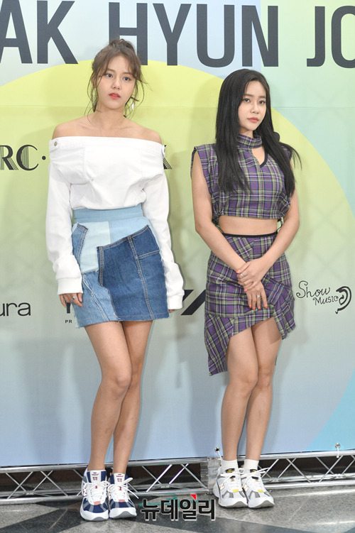 걸그룹 AOA맴버 혜정(왼쪽), 유나가 3일 오후 서울 중구 아크앤북에서 열린 '곽현주 컬렉션 2019 F/W오프쇼'에 참석해 포토타임을 갖고 있다.