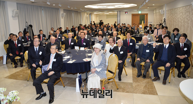 이규학 우남이승만전집발간위원장 및 참석자들이 4일 오후 서울 서대문구 연세대학교신촌캠퍼스 알렌관에서 열린 '우남 이승만 전집 제1차분 발간 기념식'에서 기념촬영을 하고 있다.