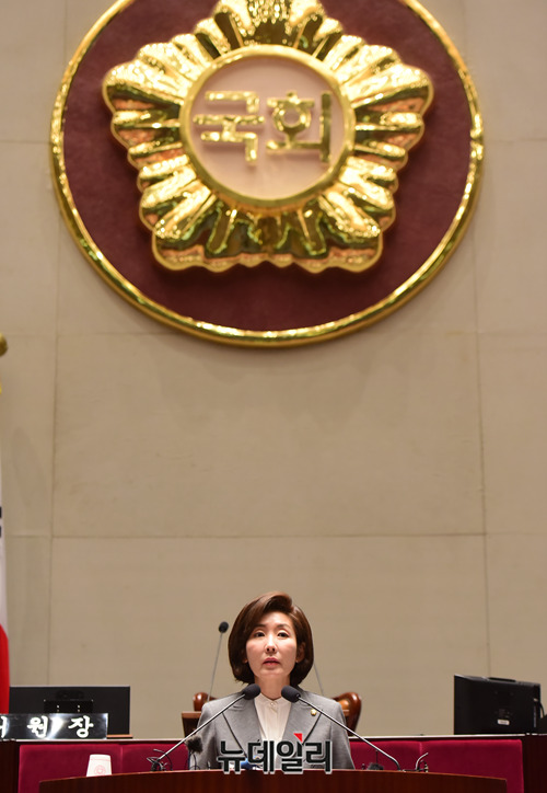 나경원 자유한국당 원내대표가 5일 오전 국회에서 열린 의원총회에서 모두발언을 하고 있다.