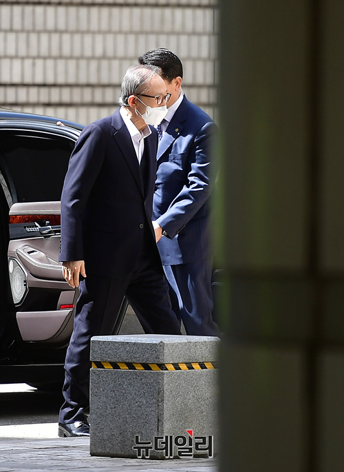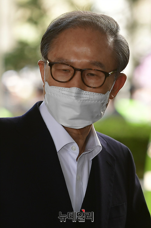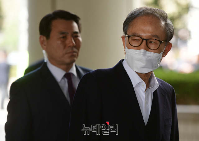이명박 전 대통령이 5일 오후 서울 서초구 서울고등법원에서 열린 재판에 참석하기 위해 차량에서 내리고 있다. 이날 재판에는 이팔성 전 우리금융지주 회장이 증인으로 참석했다.