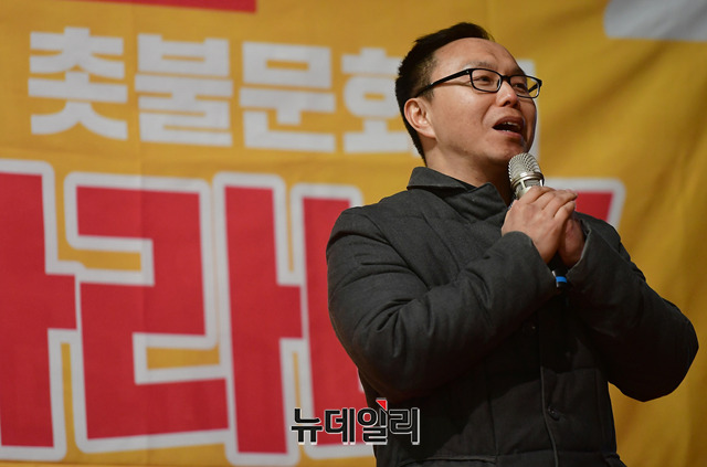 김은구 서울대트루스포럼 대표가 6일 오후 서울 종로구 혜화역 인근에서 열린 '문재인 퇴진 촛불문화제, 이건 나라냐' 2번째 집회에 참석해 발언하고 있다.이날 집회는 청년들이 연단에 올라 문재인 정권을 규탄하는 자유발언으로 진행됐다. 집회 슬로건 "이건 나라냐"는 박근혜 정권시절 촛불집회의 구호 "이게 나라냐"를 패러디한 문구로 문재인 정권을 규탄하는 구호로 사용됐다.앞서 우파 전대협은 지난달 31일 페이스북 페이지를 통해 "촛불민주시민의 명령 제2회 문재인 퇴진 촛불문화제 '이건 나라냐' 촛불혁명, 한번 더 갑시다"라는 촛불집회 홍보 포스터를 게시했다.