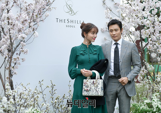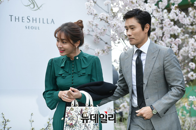 배우 이병헌, 이민정 부부가 7일 오후 서울 중구 신라호텔에서 열린 가수 이정현의 결혼식에서 준비된 포토월에 입장하고 있다.