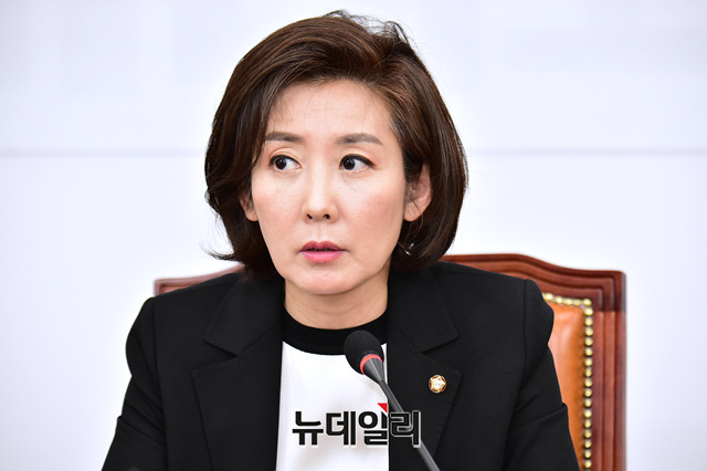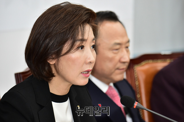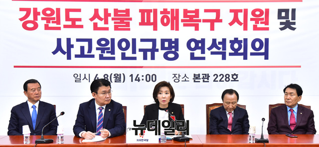나경원 자유한국당 원내대표가 8일 오후 국회에서 열린 '강원도 산불 피해복구 지원 및 사고원인규명 연석회의'에서 모두발언을 하고 있다.