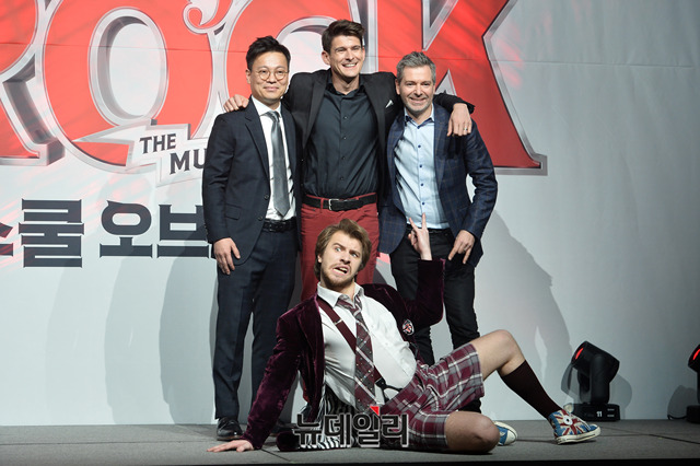 '스쿨 오브 락'의 프로듀서를 맡은 신동원 프로듀서(왼쪽부터), 주인공 역을 맡은 코너 존 글룰리, 연출을 맡은 패트릭 오닐, 프로듀서를 맡은 토번 브룩맨이 8일 오후 서울 중구 웨스틴조선호텔에서 열린 월드투어 프레스 컨퍼런스에서 포토타임을 갖고 있다.