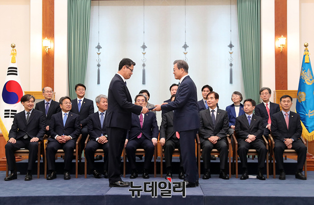 문재인 대통령이 8일 오후 청와대에서 김연철 신임 통일부 장관에게 임명장을 수여하고 있다. 앞서 열린 국회 인사청문회에서 김 신임 장관은 인사청문경과보고서가 채택되지 않았다. (사진=청와대)