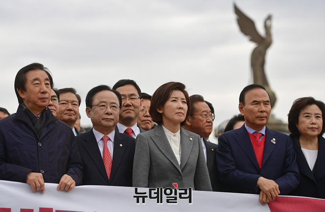 나경원 자유한국당 원내대표가 9일 오전 서울 종로구 청와대 앞 분수대에서 긴급의총을 열고, 청와대의 무능과 비리를 규탄하고 있다.