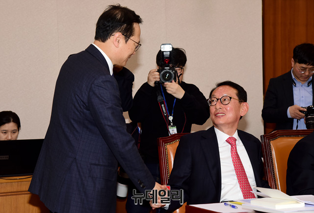 홍영표 더불어민주당 원내대표가 9일 오전 국회에서 열린 문형배 헌법재판관 후보자의 인사청문회장에 참석해 김도읍 자유한국당 법사위 간사와 손을 맞잡고 대화하고 있다.