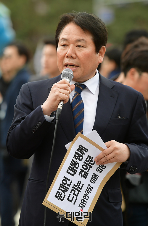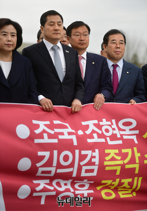 나경원 자유한국당 원내대표를 비롯한 소속의원들이 9일 오전 서울 종로구 청와대 앞 분수대에서 청와대의 무능과 비리를 규탄하는 긴급의총을 진행하고 있다. 이날 의총 직후 한국당은 문재인 대통령에게 결의문을 전달했다.