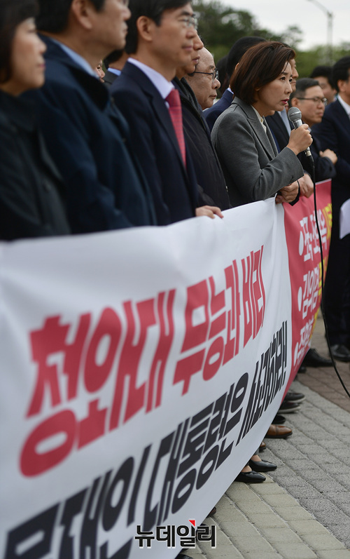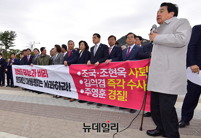 나경원 자유한국당 원내대표를 비롯한 소속의원들이 9일 오전 서울 종로구 청와대 앞 분수대에서 열린 긴급의총에서 청와대의 무능과 비리를 규탄하고 있다. 이날 의총 직후 한국당은 문재인 대통령에게 결의문을 전달했다.