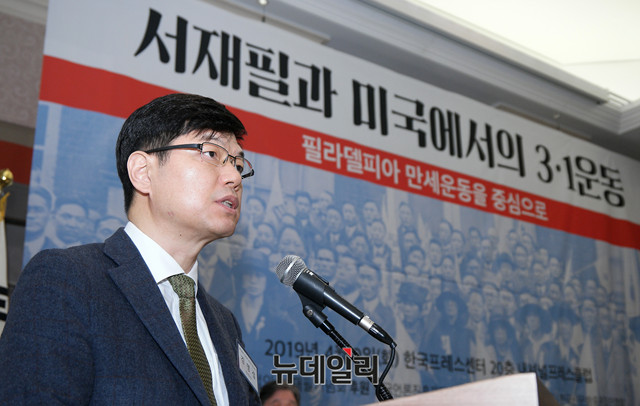 김명섭 연세대학교 정치외교학과 교수가 9일 오후 서울 중구 한국프레스센터에서 열린 3.1운동 100주년 기념 '서재필과 미국에서의 3.1운동' 세미나에 참석해 주제발표를 하고 있다.재단법인 서재필기념회가 주최한 이날 세미나는 이택휘 전 서울교육대학교 총장의 사회로 진행됐다.주제발표는 유영익 연세대학교 국제학대학원 석좌교수와 김명섭 연세대학교 정치외교학과 교수가 '서재필과 미국에서의 3.1운동', '1919년 필라델피아 대한인총대표회의의 역사정치학'을 주제로 각각 발표를 맡았다. 토론에는 정진석 한국외국어대학교 명예교수와 이선민 조선일보 선임기자가 나섰다.
