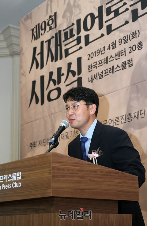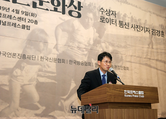 제9회 서재필 언론문화상을 수상한 김경훈 로이터통신 사진기자가 9일 오후 서울 중구 한국프레스센터에서 열린 서재필 언론문화상 시상식에서 수상 소감을 전하고 있다.