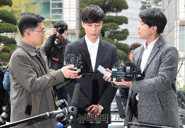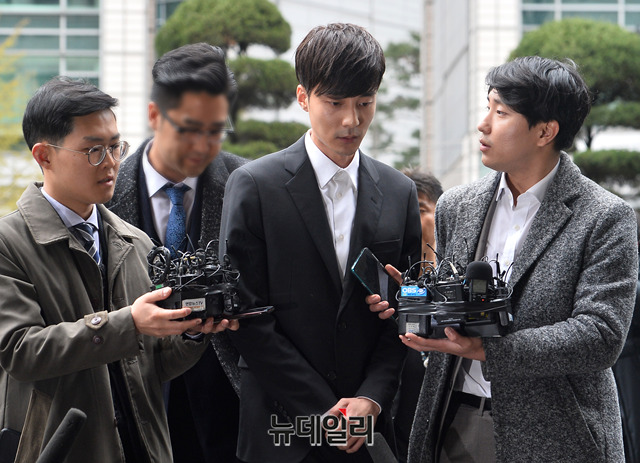 가수 로이킴이 10일 오후 서울 종로구 서울지방경찰청에 피의자 신분으로 출석해 취재진의 질문에 답하고 있다. 로이킴은 가수 정준영 등이 포함된 단체 채팅방에 음란물을 유포한 혐의를 받고 있다.