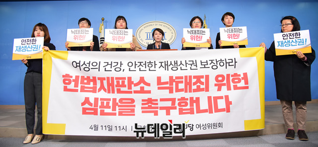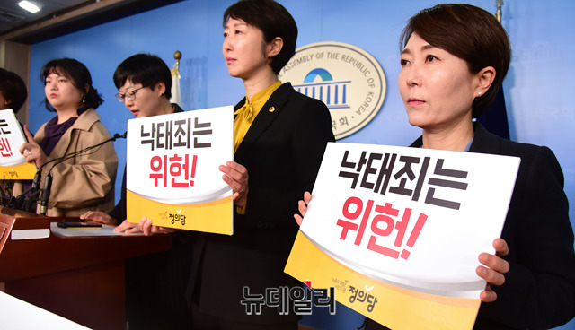 정호진 정의당 대변인 및 여성위원들이 11일 오전 국회 정론관에서 '낙태죄는 위헌'라고 적힌 피켓을 들고, 헌법재판소의 낙태죄 위헌 심판 촉구 기자회견을 하고 있다.